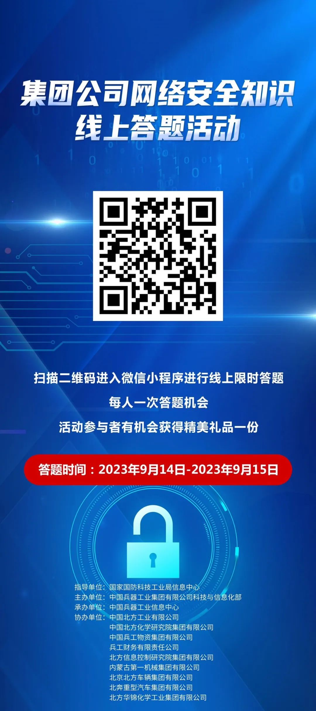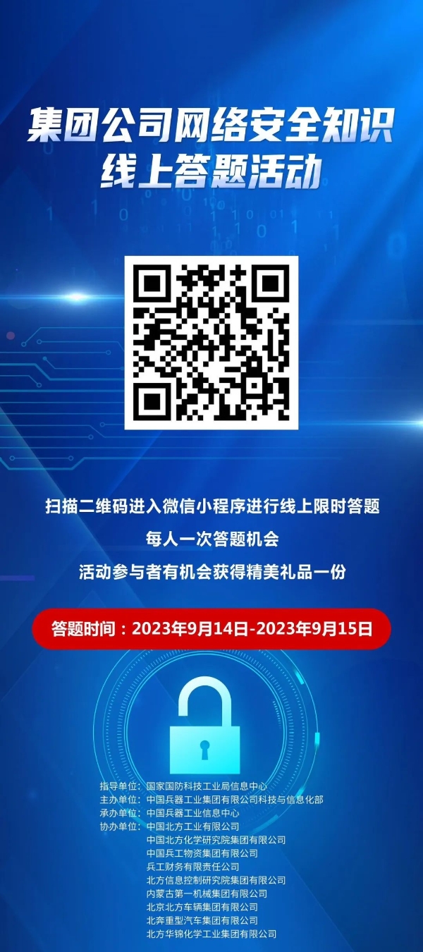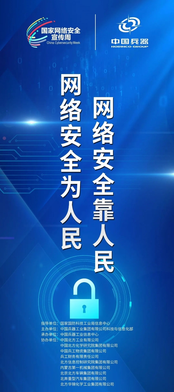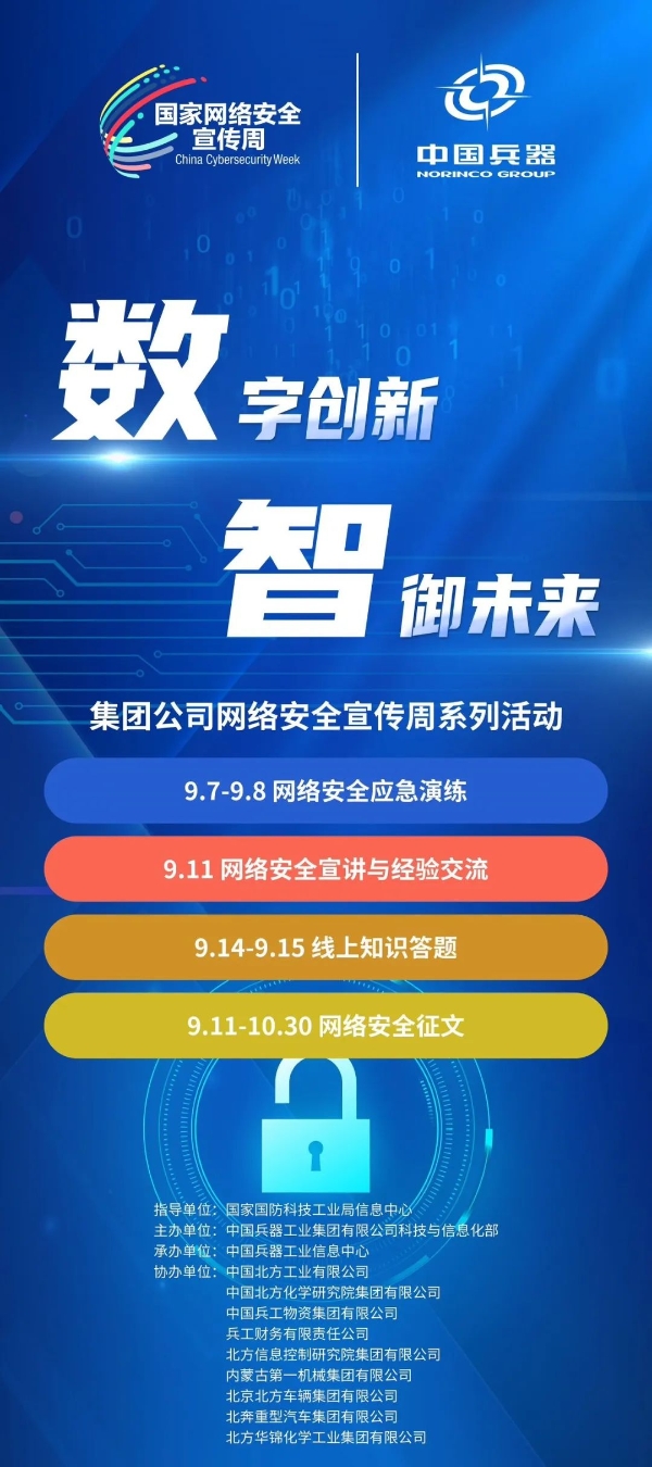 9月11日至17日,中國(guó)兵器工業(yè)集團(tuán)有限公司以“數(shù)字創(chuàng)新 智御未來”為主題,圍繞集團(tuán)公司“1+5”戰(zhàn)略和“雙十”規(guī)劃,組織開展集團(tuán)公司網(wǎng)絡(luò)安全宣傳周系列活動(dòng)。 9月11日,集團(tuán)公司科技與信息化部組織在京單位召開網(wǎng)絡(luò)安全宣講與經(jīng)驗(yàn)交流活動(dòng),邀請(qǐng)公安部第一研究所網(wǎng)絡(luò)安全專家針對(duì)網(wǎng)絡(luò)安全形勢(shì)和個(gè)人防護(hù)技能以及網(wǎng)絡(luò)安全等級(jí)保護(hù)主要工作環(huán)節(jié)和標(biāo)準(zhǔn)應(yīng)用作專題講座,會(huì)上北方公司、物資集團(tuán)、財(cái)務(wù)公司、北方車輛集團(tuán)、北奔重汽進(jìn)行了工作經(jīng)驗(yàn)分享。