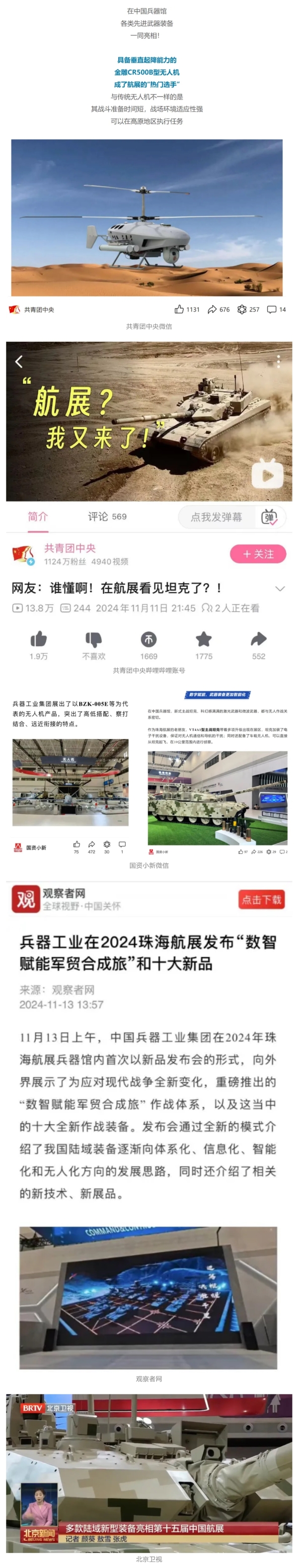 11月12日至17日,第十五屆中國(guó)國(guó)際航空航天博覽會(huì)在廣東省珠海市舉行,中國(guó)兵器工業(yè)集團(tuán)有限公司突出數(shù)智賦能軍貿(mào)合成旅作戰(zhàn)體系,帶來(lái)了一系列新產(chǎn)品、新技術(shù)、新體系,全方位展示我國(guó)陸軍外貿(mào)武器裝備發(fā)展最高水平、最新突破、最前沿成果,立體化呈現(xiàn)陸域信息化、智能化、體系化作戰(zhàn)能力,受到了全社會(huì)廣泛關(guān)注。航展期間,央視綜合頻道《新聞聯(lián)播》、央視新聞?lì)l道《新聞直播間》《長(zhǎng)空鵬程》報(bào)道兵器工業(yè)集團(tuán)參展情況,重點(diǎn)介紹了VT4A1主戰(zhàn)坦克、輪式裝甲火炮、新一代陸域指控信息系統(tǒng)、無(wú)人戰(zhàn)車(chē)、民用無(wú)人運(yùn)輸機(jī)及地面裝備演示有關(guān)內(nèi)容。央視新聞推出航展直播節(jié)目《藍(lán)天之約》,邀請(qǐng)兵器工業(yè)集團(tuán)嘉賓對(duì)參展情況、裝備動(dòng)態(tài)演示作了講解。