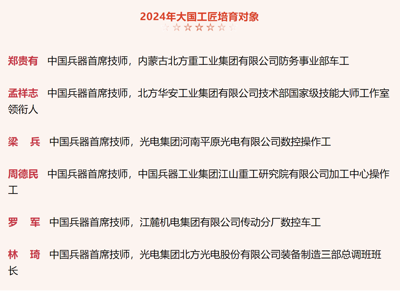 兵器工業(yè)集團6名高技能人才入選2024年大國工匠培育對象名單 |