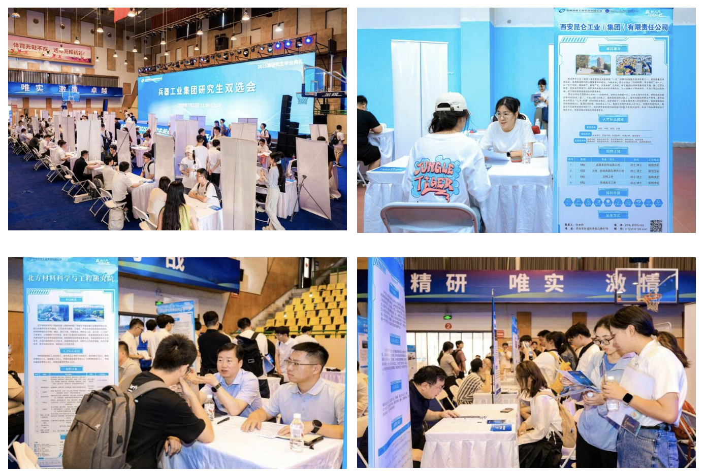 畢業(yè)生代表回顧成長歷程,感謝培養(yǎng)平臺與導師指導,誓言投身國防事業(yè)。導師代表肯定學生科研淬煉的“嚴謹”與“擔當”,寄語傳承人民兵工精神,在強軍報國中實現(xiàn)價值。校友代表以科研經歷詮釋兵工人使命,勉勵學弟學妹以裝備成果接力書寫強軍報國答卷。全體師生共同唱響《強軍有我》,鏗鏘有力的歌聲回蕩在體育館內,既飽含著對青春理想的告白,更傳遞出投身國防事業(yè)的堅定信念,為這場畢業(yè)盛典增添了厚重的使命底色。 典禮的莊重氛圍未散,兩場精準對接國防需求的雙選會已在相鄰場館同步開啟。60家集團公司下屬單位的招聘人員與2025屆畢業(yè)生、在讀研究生及工程碩博士們圍坐洽談,圍繞崗位需求與項目方向,以簡歷和科研成果為媒展開深度對接。這場覆蓋多層次人才的就業(yè)服務,精準銜接科研人才儲備與國防需求,為兵器事業(yè)高質量發(fā)展注入活力。  兵器工業(yè)集團研究生雙選會現(xiàn)場